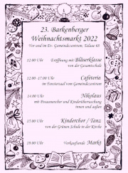 | 19:25, 15. Dez 2023 | BWM 22 Plakat.jpg (Datei) | 153 KB | 23. Barkenberger Weihnachtsmarkt - Plakat | 1 | |