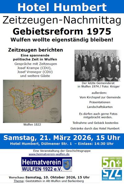 Sa 21.3. 15 Uhr, Zeitzeugen-Nachmittag "Wulfen wollte eigenständig bleiben", zur Gebietsreform 1975, Ort: Hotel Humbert, Veranstalter: Geschichtsgruppe des Heimatvereins