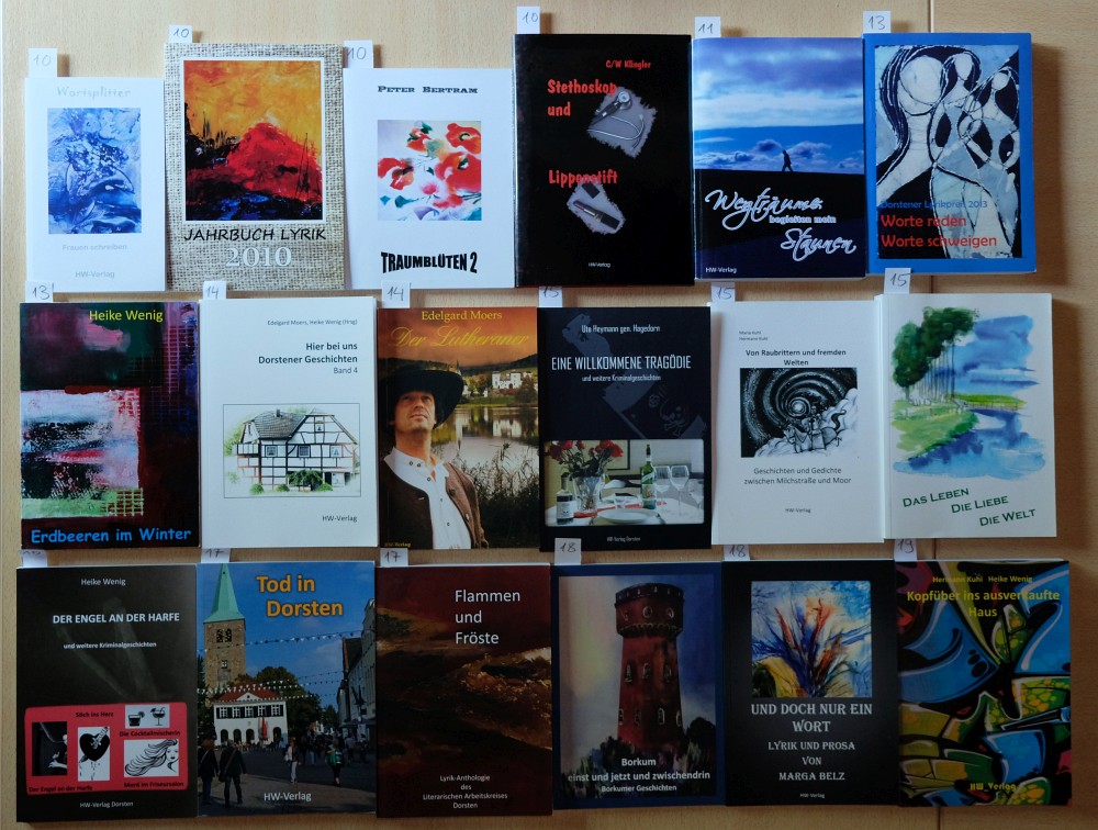 2011 Wegträume begleiten mein Staunen: Dorstener Lesezeichen ; eine Anthologie des Literarischen Arbeitskreises Dorsten / Heike Wenig ... (Hrsg.), Dorsten: HW-Verl., 2011 253 S. | +2006 Kuhl, Hermann: Goethes Reise nach Britannien - mit Christiane Vulpius. Dorsten: Heike Wenig Verlag, 2006. 3-932801-50-4 ?? ISBN doppelt vergeben? = Borkumer Geschichten!) | ||