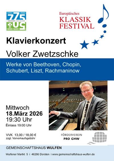 Mi 18.3. 19.30 Uhr, Klavierkonzert: Volker Zwetschke. Vorverkauf im GHW. (Veranstalter ProGHW) Der in Recklinghausen geborene Pianist Volker Zwetzschke gastiert anlässlich des „Stadtjubiläums – 50 Jahre kommunale Neuordnung“ im Gemeinschaftshaus Wulfen, wo er klassisch-romantische Werke von Beethoven, Chopin, Liszt, Alkan und Rachmaninow interpretieren wird.