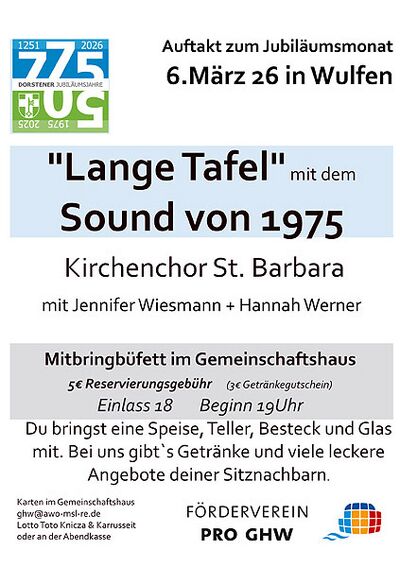 '''Fr 6.3. 19 Uhr Die "lange Tafel" im Gemeinschaftshaus. ''' ProGHW lädt zu einem Mitbringbüffet ein. Vorherige Anmeldung im GHW nötig! Als Rahmenprogramm: '''Der Sound von 1975''', kleines Mitsing-Konzert mit dem Kirchenchor St. Barbara | |||