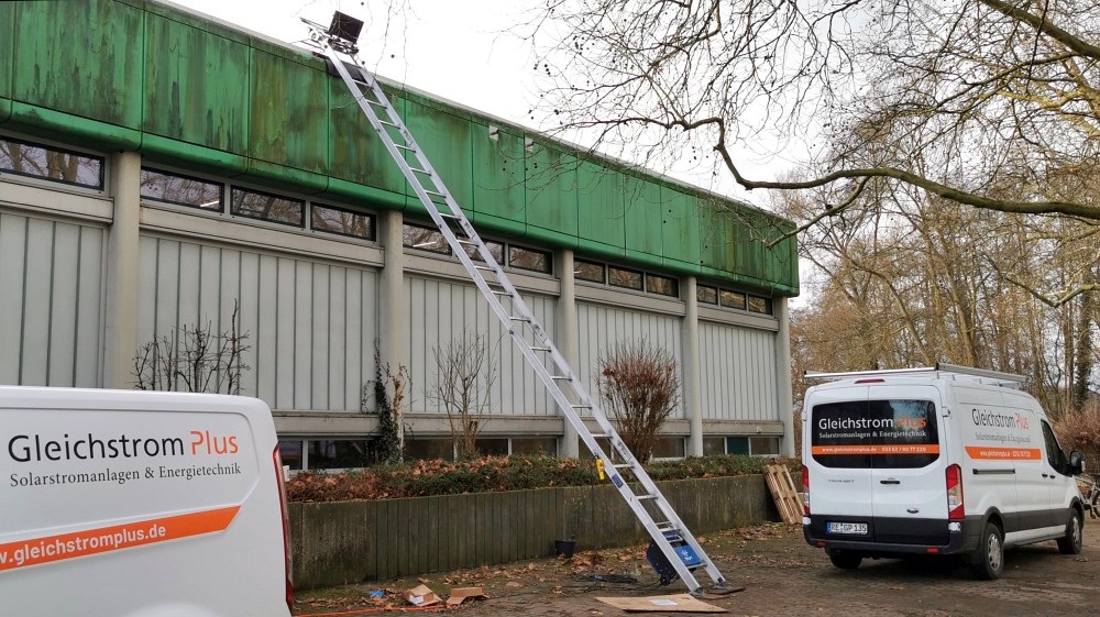[[Datei:Grüne Schule Solardach Installation.jpg|framed|'''Auf dem Dach der Sporthalle an der Grünen Schule wird eine Photovoltaik-Anlage installiert''', 16.1.]] | |||