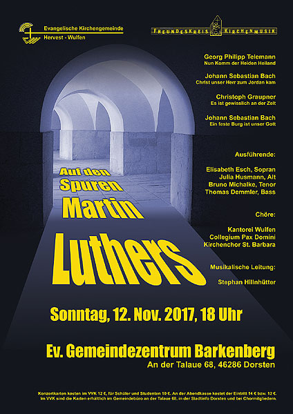 Sonntag, 12.11.2017, 18 Uhr: Chorkonzert "Auf den Spuren Martin Luthers" im Ev. Gemeindezentrum Barkenberg, An der Talaue 68. Es sind Kantaten von Georg Philipp Telemann, Johann Sebastian Bach und Christoph Graupner zu hören. Die Solisten sind: Elisabeth Esch (Sopran), Julia Husmann (Alt), Bruno Michalke (Tenor) und Thomas Demmler (Bass). Es wirken mit die "Kantorei Wulfen", einige Mitglieder vom "Collegium Pax Domini" und bei der Bach-Kantate "Ein feste Burg ist unser Gott" auch der "Kirchenchor St. Barbara". Die musikalische Leitung liegt bei Kirchenmusiker Stephan Hillnhütter. Die Konzertkarten kosten im VVK 12 €, für Schüler und Studenten 8 €. An der Abendkasse kosten sie 14 € bzw. 12 €. Die Karten sind ab sofort erhältlich im Gemeindebüro an der Talaue 68, bei der Stadtinfo Dorsten und bei den Chormitgliedern.
