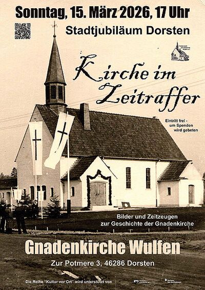 So 15.3., 17 Uhr: „Kirche im Zeitraffer“ - Geschichte der Gnadenkirche als Beitrag zum Dorstener Stadtjubiläum. Wir lassen mit vielen Bildern und Zeitzeugen die Geschichte der Gnadenkirche Revue passieren. Einige Eckdaten: 1953 erbaut, ab 1969 eigenständige Gemeinde Wulfen, 1973-2000 ein in Deutschland einmaliges „Gruppenpfarramt“, 2007 Gemeindefusion mit Hervest, 2012 Gründung eines Fördervereins, 2023 Übernahme der Gnadenkirche durch den Förderverein Gnadenkirche Wulfen e.V. in eigene Trägerschaft. Eintritt frei - um Spenden wird gebeten. Alle Infos zu den Angeboten in der Gnadenkirche in 2026 gibt es auf https://wulfen-wiki.de/index.php?title=Gnadenkirche#Aktuelles