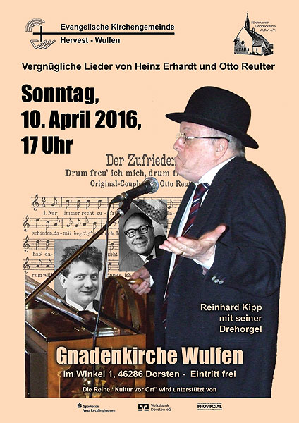 Sonntag, 10. April 2016, 17 Uhr: Schwelgen in alten Zeiten. Reinhard Kipp aus Raesfeld war schon einmal mit Berliner Liedern aus dem Heinrich-Zille-Milieu in der Gnadenkirche zu Gast. Auch diesmal gibt es etwas zu lachen. Er singt Lieder von Heinz Erhardt und Otto Reutter und begleitet sich selbst auf seiner historischen Drehorgel. Der Förderverein sorgt für Bewirtung. Der Eintritt ist frei - um eine Spende wird gebeten.