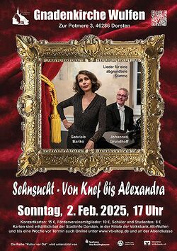- Sonntag, 2. Februar 2025, 17 Uhr: "Sehnsucht - Von Knef bis Alexandra“ - Lieder für eine abgrundtiefe Stimme. “Für mich soll’s rote Rosen regnen“, “Mein Freund der Baum“, “Kann denn Liebe Sünde sein?“ - um nur einige der Lieder zu nennen, deren Interpretinnen allesamt mit charakteristisch tiefen Altstimmen aufwarten konnten. Gabriele Banko vereint mit ihrem markanten und volltönenden Alt solche Lieder zu einem berauschenden Abend zwischen Melancholie und Heiterkeit. Sie wird am Piano begleitet von Johannes Grundhoff vom Bremer Kaffeehausorchester. Die Großmutter soll ihr gesagt haben: „Du hast ‘ne Stimme wie ein Saufbold!“ Doch später studierte Gabriele Banko Gesang an der Frankfurter Musikhochschule. Die Konzertkarten kosten 15 €, für Fördervereinsmitglieder nur 10 €, Schüler / Studenten 8 €. VVK bei der Stadtagentur in Dorsten, in der Alt-Wulfener Filiale der Volksbank und auch Online im vb-shop.de oder an der Abendkasse. Das Konzert wird von dem Verein "Dorsten dankt dir" unterstützt.
