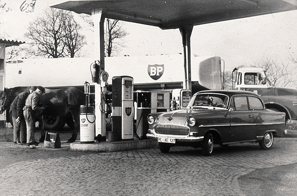 Eine historisches Foto: Pferd, Tankwagen und Opel Record nebeneinander