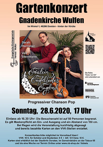 | aktuell | 10:45, 6. Jun 2020 | 424×600 (95 KB) | Wul (Diskussion | Beiträge) | Chansons im Garten mit Sarah Horneber und Veit Steinmann |