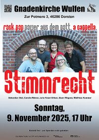 - Sonntag, 9. November 2025, 17 Uhr: „Stimmrecht“ Stimmrecht ist geballte A-cappella-Power aus dem Pott: 2 Frauen, 3 Männer auf der Bühne, einer im Hintergrund am Mischpult, ein paar Mikrofone, etwas Technik – reicht! Sebastian Diel, Carolin Römer, Julia Knorr-Urban, Matthias Kummer und Swen Wagner singen Rock und Pop, überwiegend Coverversionen, meistens auf Deutsch, immer voller Energie und in eigenen Versionen, manchmal zusammen mit dem Publikum. Der Eintritt zu dem Konzert ist frei - um Spenden wird gebeten.