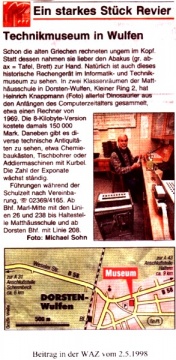 | 17:06, 8. Jan 2009 | 2002.05.08. Dorstener Zeitung.jpg (Datei) | 158 KB | Zeitungsausschnitt zum Museum aus der Dorstener Zeitung vom 08.05.2002 | 1 | |