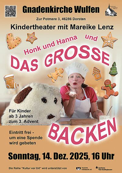 Sonntag, 14. Dezember, 3. Advent, 15 Uhr: Kindertheater „Das große Backen“ mit Honk und Hanna. Schauspielerin Mareike Lenz bietet ein besonderes Weihnachtsstück für Kinder ab 3 Jahren an: „Das große Backen“. Honk und Hanna backen Plätzchen - aber nicht irgendwelche! Es ist ein Spezialrezept von ihrer Ur-Ur-Omma! Damit wollen Sie bei dem großen Backwettbewerb im Dorf teilnehmen. Aber ob sie gegen Antonios Eistorte und Frau Lilas glutenfreie, laktosefreie, vegane Torte, damit eine Chance haben? Der Eintritt ist frei - um eine Spende wird gebeten. Alle Infos zu den Angeboten in der Gnadenkirche in 2025 gibt es auf https://wulfen-wiki.de/index.php?title=Gnadenkirche#Aktuelles