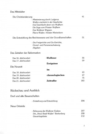Der einführende Teil der Abhandlung befasst sich mit volks- und zeitgeschichtlichen Ereignissen der ferneren Vergangenheit unserer Heimat. Neben der kulturgeschichtlichen Entwicklung unseres Heimatraumes und darüber hinaus dürften auch die im hiesigen Raum durchgeführten archäologischen Ausgrabungen und ihre Ergebnisse für die Heimatfreunde außerhalb der Wulfener Grenzen von großem Interesse sein. Der weitere Inhalt des Buches widmet sich dann den Ereignissen der Wulfener Geschichte in Vergangenheit und Gegenwart. Aufgrund der damaligen Zugehörigkeit Deutens zu Wulfen wurden auch die dort bis 1968 stattgefundenen Ereignisse berücksichtigt. Der Vollständigkeit halber ist dies in der Chronologie besonderer Wulfener Ereignisse und Begebenheiten bis zur Fertigstellung des Buches fortgeführt worden. Ausführungen über das "Brauchtum" hat die Geschichtsgruppe des Heimatvereins Wulfen zum Teil aktuell überarbeitet, wobei zusätzlich das Wulfener "Nachbarschaftswesen" geschildert wird. Das Buch beinhaltet u.a. auch die Kapitel "Rückschau und Ausblick" (Neue Orsteile/Barkenberg), "Interessantes und Wissenswertes" (Flachs und Leinen/Rose-Brauerei/Muna) und "Kontakte", in denen alte Bauerschaften, neue Ortsteile und Wulfener Zeitgeschehen in Einzelbeiträgen vorgestellt werden sowie auf Vereine, Gruppen und Institutionen aufmerksam gemacht wird. | |||
