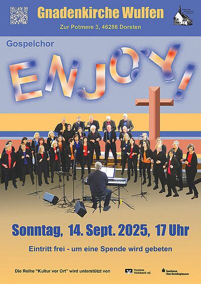 Sonntag, 14.9., 17 Uhr: „Enjoy!“ Der gemischte Gospelchor „Enjoy!“ aus Rhade unter Leitung von Christian Löer steht für bewegende, bekannte und moderne Gospels, Worshiplieder und Popsongs in deutscher und englischer Sprache. Die Stücke werden ein- bis vierstimmig vorgetragen. Im September 2024 feierte „Enjoy!“ sein 25-järiges Bestehen. Der Eintritt zum Konzert ist frei - um eine Spende wird gebeten. Alle Infos zu den Angeboten in der Gnadenkirche in 2025 gibt es auf https://wulfen-wiki.de/index.php?title=Gnadenkirche#Aktuelles