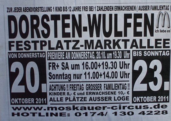 '''20.-23.10. Moskauer Zirkus''' Festwiese an der Polizei, http://www.moskauer-circus.de/ | |||