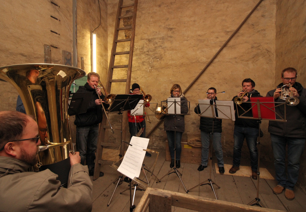 [[Datei:Turmbläser 17 1000.jpg|framed|'''Eine Gruppe der Blasmusik Wulfen spielte zuerst im Gottesdienst und anschließend oben im Kirchturm Advents- und Weihnachtslieder''', 16.12.17]] | |||