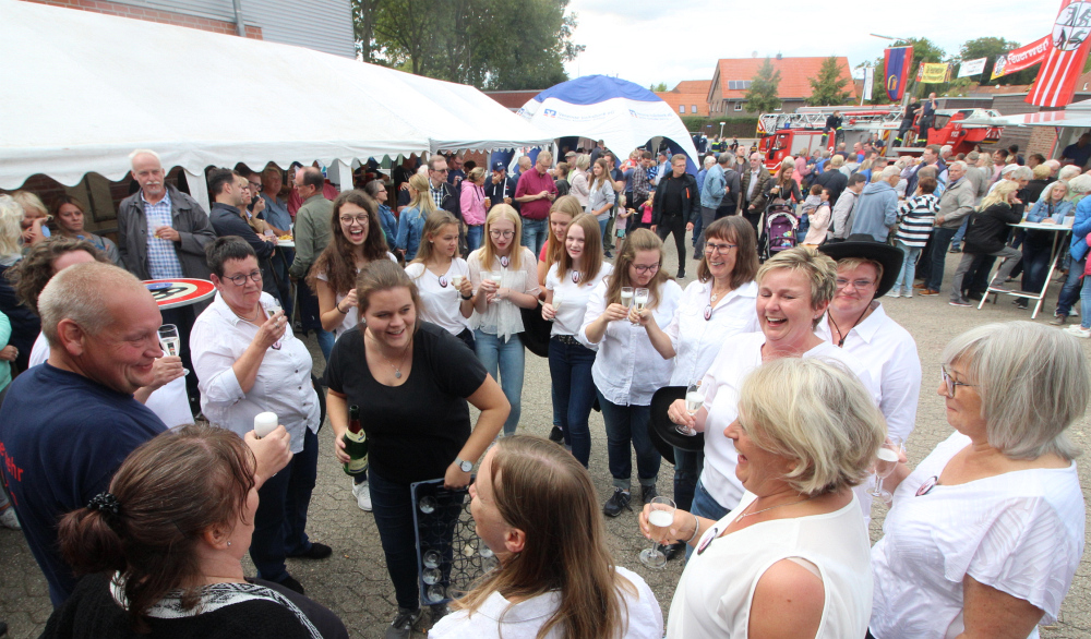 [[Datei:FFW 112 Jahre Linedancer Sekt.jpg|framed|'''"Ich hab da mal was vorbereitet": Organisator Reiner Schulze-Tenberge bedankt sich mit einer Runde Sekt bei den Feuerwehrfrauen für ihren Linedance-Auftritt''', 7.9.]] | |||