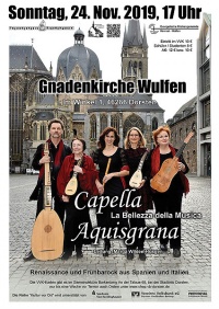 [[Datei:Aquisgrana-Plakat.jpg|thumb|200px|''' | [[Datei:Aquisgrana-Plakat.jpg|thumb|200px|'''Kunstvolle Musik aus Renaissance und Frühbarock''']] | ||