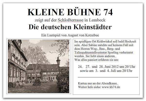 | 13:33, 6. Jul 2011 | KB74-Anzeige.jpg (Datei) | 43 KB | Theaterstück-Ankündigung. Austausch eines vorhandenen Bildes. | 1 | |