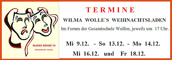 | 14:10, 9. Okt 2015 | KB74-Termine-2015.jpg (Datei) | 43 KB | TERMINE - Ankündigung für das neue Kinderstück. | 1 | |