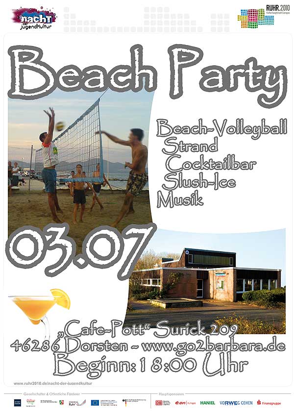 Sa 3.7. Beach-Party Beach Party im Jugendheim "Cafe-Pott". Beach-Volleyballturnier, Slush-Ice uvm. Infos: http://www.go2barbara.de Beginn: 18 Uhr