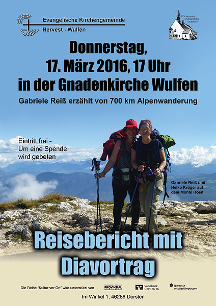 Donnerstag, 17. März 2016, 19 Uhr: Reisebericht von Gabriele Reiß. Die Dorstenerin Gabriele Reiß stellt in einem Lichtbildervortrag ihre mehrjährige Alpenwanderung von Starnberg nach Bardolino am Gardasee durch Bayern, Tirol, Südtirol, Trentino nach Venetien und das daraus entstandene Buch vor.(40 Tage - 700 km). Der Eintritt ist frei - um eine Spende wird gebeten.