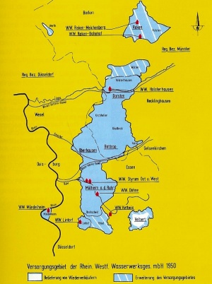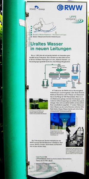 "Das Grundwasserwerk Dorsten-Holsterhausen ist seit 1927 in Betrieb. Es gewinnt Trinkwasser aus der Brunnengalerie Holsterhausen. Durch die neue Brunnengalerie Üfter Mark wurde 1974 die Wassergewinnungskapazität auf 29 Mio. m³/a erweitert. Eine umfangreiche Modernisierung des gesamten Werkes wurde in den Jahren 1991 bis 1993 durchgeführt. Die insgesamt 64 Brunnen beider Galerien fördern aus 80 bis 120 Meter Tiefe natürliches Grundwasser aus den "Halterner Sanden". Das Grundwasser ist frei von Verunreinigungen und benötigt für einen Teilstrom (Brunnengalerie Holsterhausen) nur noch eine Enteisenung, bevor es in das Trinkwassernetz der RWW gelangt. Das zurückgehaltene Eisen wird in Schlammabsetzbecken aufgefangen und einer Schlammwasseraufbereitungsanlage zugeführt. Der anfallende Eisenschlamm wird nach der Entwässerung entsorgt. Im Wasserwerk arbeiten 19 Mitarbeiter/innen. Im Jahr 2004 wurden im Wasserwerk Dorsten-Holsterhausen 24,2 Mio. m³ Grundwasser gefördert und aufbereitet."