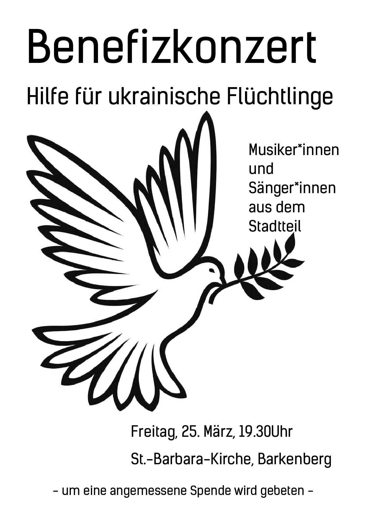 MusikerInnen und SängerInnen aus dem Stadtteil gaben am 25.3. um 19.30 Uhr ein Benefizkonzert zugunsten ukrainischer Flüchtlinge, siehe Plakat. Organisation: Felicia Meyerratken.