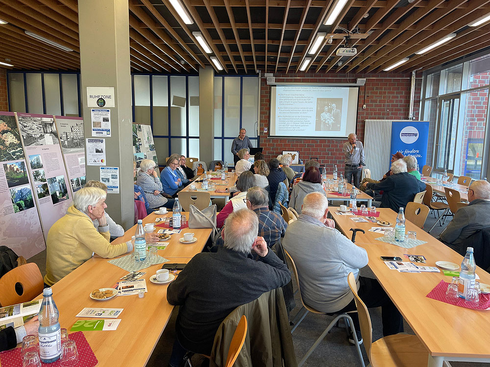 Diskussion über Frauen in der Kommunalpolitik, umrahmt von Wulfen-Tafeln
