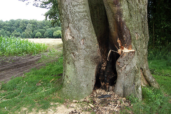 Alte mehrstämmige Buche am Schultenfeld. Nach einem Brand im Hohlraum hat die Feuerwehr zur Sicherheit einen Ast enfernt, gruber 30.7.09