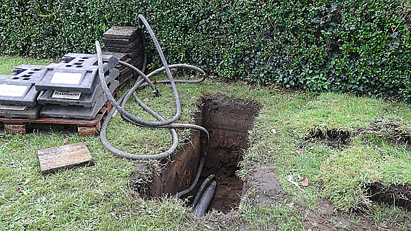 Die Hecke kann stehen bleiben. Die Leitung wird unten drunter durchgebohrt.