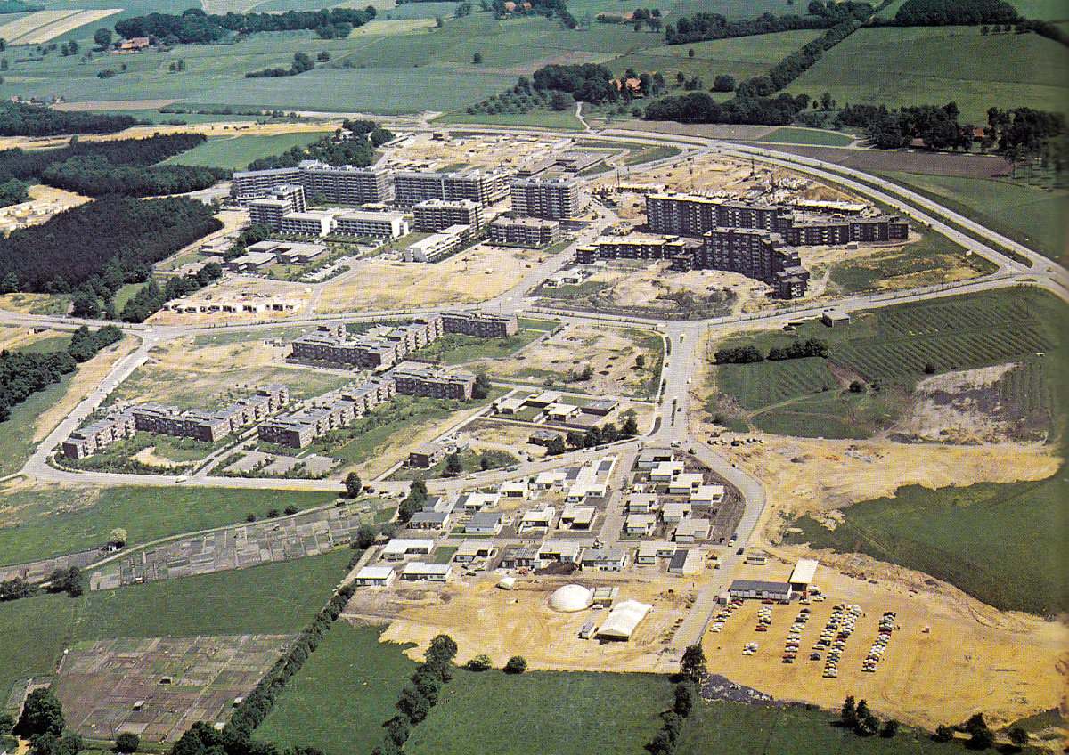 Quelle: zeitgenössisches Buch, Titel ??. Bildüberschrift: "Nördlich der Lippe, an der Schwelle zum Münsterland, entsteht die neue Stadt Wulfen, in der der Wohnstandard des Jahres 2000 erprobt werden soll."