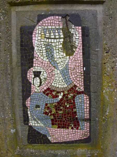 Beschädigtes Mosaik hinter St. Barbara am Aufgang zur Bushaltestelle, durch Zaun seit längerer Zeit nicht mehr frei zugänglich, gruber 12/08