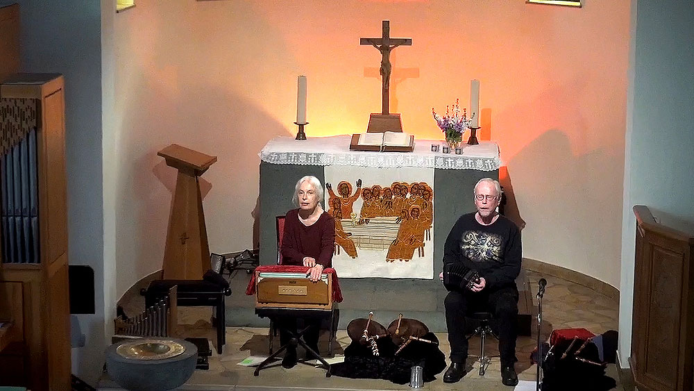 Hier spielt Ulrike von Weiß auf einem "Indischen Harmonium", das die Töne auch mit einem Blasebalg erzeugt.