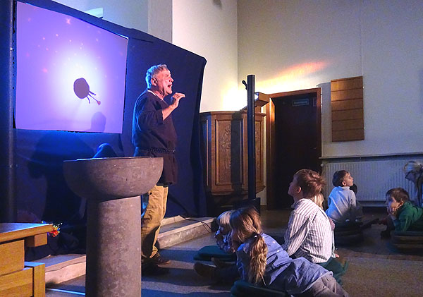 Aktion vor und hinter der Leinwand - hier ist ein kleiner Planet mit einer Straßenlaterne zu sehen
