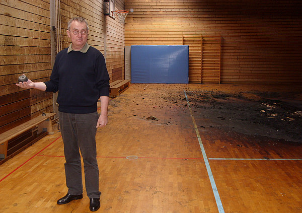 Schulleiter Kratz in der verrussten Turnhalle nach Brandstiftung, gruber 9.4.09
