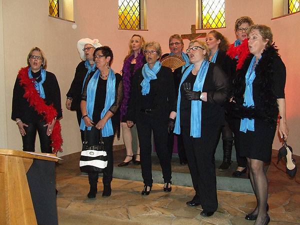 Der A Capella Frauenchor "Vocal Blue" sorgte für einen Besucherrekord in der Gnadenkirche Wulfen. Bei dem Song "Girl, Girl, Girls" kamen auch witzige Requisiten zum Einsatz. Foto: Sabine Bornemann: 2.4.2017)