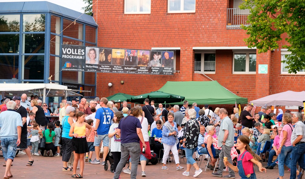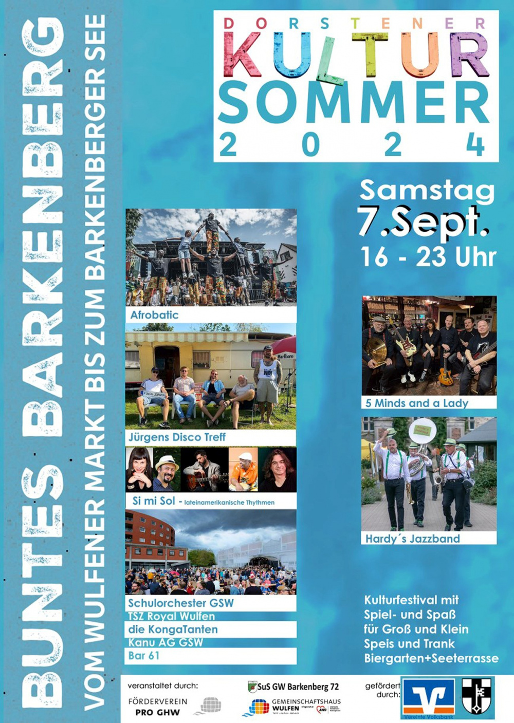 Bild von Ulla WüllnerWas ist zu tun? Besprechung der proGHW-Aufbauaktiven Für den Aufbau des Zeltdaches sind ein Riesenkran und viele fleißige Frühaufsteher erforderlichGroßartig "Legosteine" sorgen für Sicherheit bei eventuellen WindböenAufbau der Bühne. Miete, Auf- und Abbau, Licht- und Audiotechnik kosten viel GeldVerschieben des Zaunes, um weiteren Platz zu gewinnen Die Kanu AG der Gesamtschule bringt zwei Kanus für ihre kostenlosen Bootsfahrten auf dem SeeGrün Weiß hat starke Jungs ! Unter den Platanen baut Grün Weiß einen Biergarten aufBegrüßung durch Lasse Schulte von der Kanu AG und den Veranstaltern Marlies Krause-Flaßbeck (Gemeinschaftshaus/AWO), Swen Coralic (Grün Weiß Barkenberg), Hannes Schmidt-Domogalla (Förderverein proGHW) Hannes Schmidt-Domogalla, der "Kopf" der Veranstaltung, bei einer Moderation, Foto: Bernd Müller-KnospeDen Auftakt macht Hardy`s JazzbandHardy's Jazzband Band verlässt die Bühne und spielt zwischen den Menschen"Buntes Barkenberg" : schon zum Beginn um 16 Uhr sind viele daFoto: Schmidt-DomogallaFoto: Schmidt-DomogallaKaffee und Kuchen vom Team des Marktcafés (immer freitags 9-12 Uhr im Gemeinschaftshaus)Syrische Salate und Kuchen kommen gut anFoto: Bernd Müller-KnospeMalaktion Am Stand von St.Barbara ist u.a. ein Puzzle zu lösenDie Barbara-Bar hatte auch Rhabarbersaft ;-) Die Kirchengemeinde St.Barbara stellt Angebote für den Stadtteil vor, Foto: Bernd Müller-KnospeErster Auftritt von Afrobatic, die mehrere Umbaupausen auf der Bühne überbrücken Foto: Bernd Müller-KnospeBarkenberg steht Kopf !Afrobatic auf der Bühne, Foto: Bernd Müller-KnospeZuckerwatte vom Förderverein proGHW verteilt an Kinder kostenloses WassereisDas städtische Spielmobil hat viel mitgebracht Dieser Werfer trifft !Temporäre Tattoos vom KiJuFaZ, Foto: Guido BludauStand der Naturpark-Führer, Foto: Guido BludauBestes Wetter für ein Eis bei RinoGregor Preis und die KongaTantenDie Kellerband spielte zusammen mit den KongaTanten Auftritt des TSZ Wulfen, Foto: Schmidt-DomogallaFoto: Schmidt-DomogallaKostenlose Bootsfahrten durch die Kanu AG der Gesamtschule Die Terrasse der Bar61 Weinangebot der Männer von St. BarbaraDer Bürgermeister im Gespräch mit Hannes Schmidt-Domogalla und Horst Riemer (Grün Weiß) Foto: Guido Bludau 5 Minds and a Lady, Foto: Guido BludauEin schöner Sommerabend bei bestem BiergartenwetterGrün-Weiße Pommes China-Nudeln zu später StundeDie lateinamerikanische Gruppe "Si mi Sol"Tanz-Paar Feuerschau der Acrobatics Tut das weh oder ist das nur Show? Feuerball Foto: Schmidt-DomogallaNach dem Auftritt von Jürgen´s Disco Treff verkündet Hannes Schmidt-Domogalla um kurz nach 23 Uhr das Ende des außergewöhnlichen AbendsNach Konzertende für die Aufräumer noch eine originelle Session mit Mülltonnen als Schlaginstrumenten Die Veranstaltung hatte wettermäßig den letzten Sommertag des Jahres erwischt: 28 Grad und praktisch kein Wind. Viele Schleierwolken, sodass die Sonne nicht so brannte und sich am Abend die Luft nicht so stark abkühlte.Nachdem es an den bislang 250 Tagen dieses Jahres an 145 geregnet hat, war der 7.9. glücklicherweise niederschlagsfrei