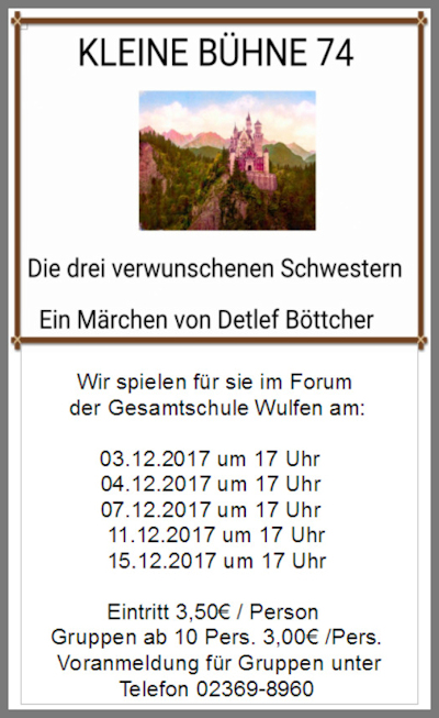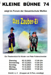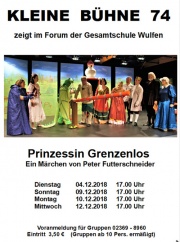 | 20:28, 23. Okt 2017 | WW-KB74-600.jpg (Datei) | 402 KB | Plakat für Theateraufführungen der Kleinen Bühne 74 im Dezember | 1 | |